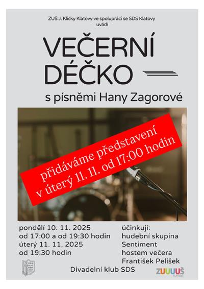 Hudební skupina Sentiment již po několik let v klubu klatovského divadla uvádí tradiční pořad Večerní Déčko, jehož tematická zaměření vždy úzce souvisí i s hudební částí večera. Podzimní termín si klade za cíl zmapovat tvorbu známé české zpěvačky Hany Zagorové. Posluchači se mohou těšit na průřez bezmála šedesátileté kariéry jedné z nejoblíbenějších českých zpěvaček, chybět nebude ani tradiční host. | ||