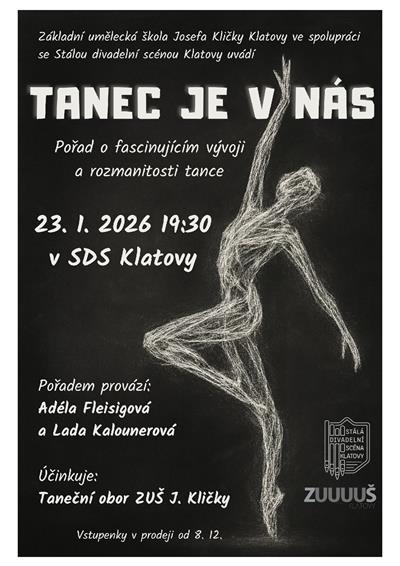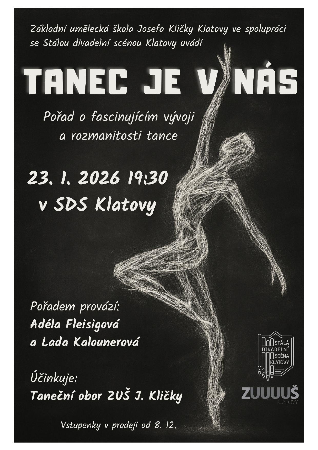 Vzdělávací pořad Tanec je v nás provází diváky fascinujícím vývojem tance od jeho prastarých rituálních kořenů až po současné moderní formy. Prostřednictvím ukázek, rozhovorů a krátkých choreografií představuje rozmanitost tanečních stylů a jejich význam pro člověka i společnost. Pořad inspiruje k zamyšlení nad tím, že tanec není jen umělecký výraz, ale i přirozený způsob komunikace a propojení těla, duše a hudby - protože tanec je skutečně v nás. Pořad je určen všem, kteří chtějí objevovat tanec a jeho příběh - od dětí až po dospělé. Pořadem provází Adéla Fleisigová a Lada Kalounerová, účinkuje taneční obor Základní umělecké školy J. Kličky Klatovy. | ||