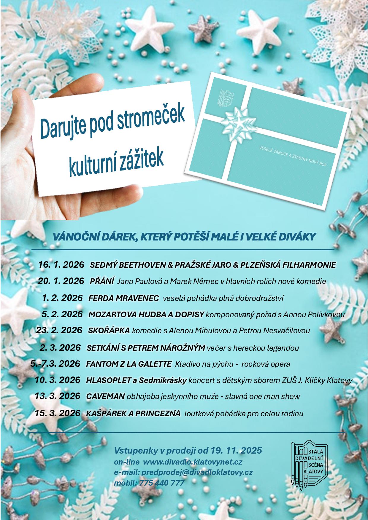 Obdarujte své blízké vstupenkami do divadla nebo dárkovým poukazem. Vybírat můžete z celé řady komedií, koncertů a pohádek. K zakoupeným vstupenkám dostanete dárkovou obálku a letáček.